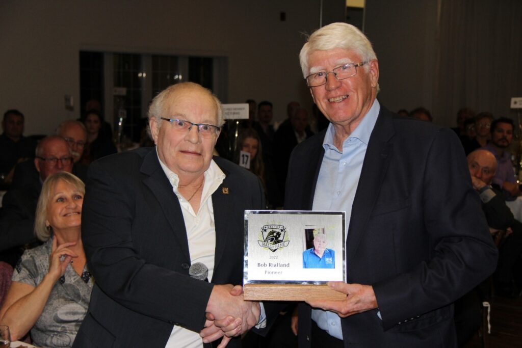 Figure 16. Bill Forbes (right) presenting Bob Rialland (left) with his “Pioneer” Award at the MRHOF Banquet, October 30, 2022. Bob’s wife, Pat (seated) can be seen to the left and behind Bob (Photo courtsey of MRHOF).