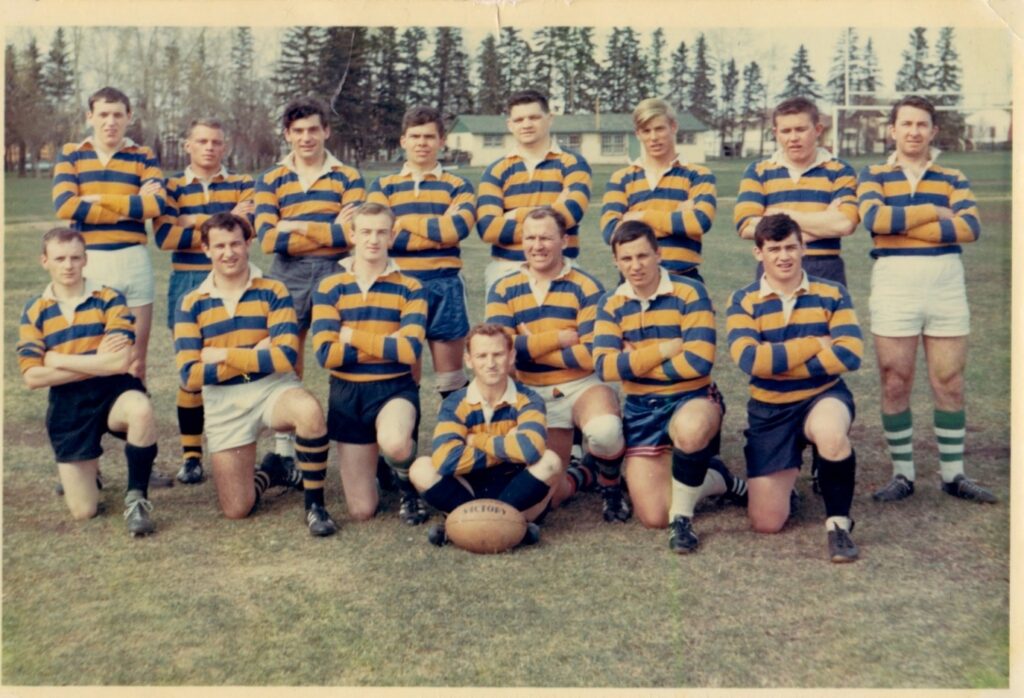 Figure 1. This picture was taken in May 1967 and shows a group of rugby players representing two Winnipeg Rugby Teams — the Wasps and the Wanderers — who travelled to Edmonton to play against the Edmonton Pirates rugby team. (Photo courtesy of Bob Rialland).