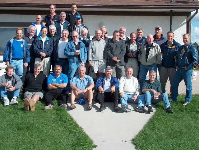 Figure 3. Picture taken at the 2003 Assassins RFC reunion in Winnipeg, including club founders Clint Evans, Bob Rialland, and Jim Platt, and many of the guys who played during the Assassins’ early years, 1968-1972. Seated: Brian Tomchuk, John Samm, Ed Chapman, Bob Rialland, Rod Kachulak, Don Pincock, and Bob Boughey. 2nd Row: Dwight Evans, Dave Yauniskis, Bruce ZImmer, Rick Wilson, Don Steele, Tom Haines, Jim Platt, Ray Ash, Karl Ruban, and Clint Evans. 3rd Row: Dave Samm, Bill Forbes, John Silver, Bart Evans, Brad Oswald, Bob Keating, Ian McLeod, Bob Toogood. 4th Row: Gil Bramwell, Bill Downie, Mike Forbes. 5th Row: Buzz Tisdale, Vic Krisciunas, (Photo courtsey of Clint Evans)