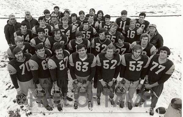 Figure 5. 1970 University of Manitoba Bison’s Football team (Photo courtesy of John Silver). In addition to Clint (16), also present are other players from the early Assassins Rugby Football team including: Ian McLeod (70), Bob Keating (63), Bart Evans (53), Robin Wright (77), Bob Toogood (32), Mark Milan (60), Jack Galbraith (58), Clint Evans (16), Gil Bramwell (31), John Silver (62), Jamie Horne (11), and Bob Jaskiewicz (68)