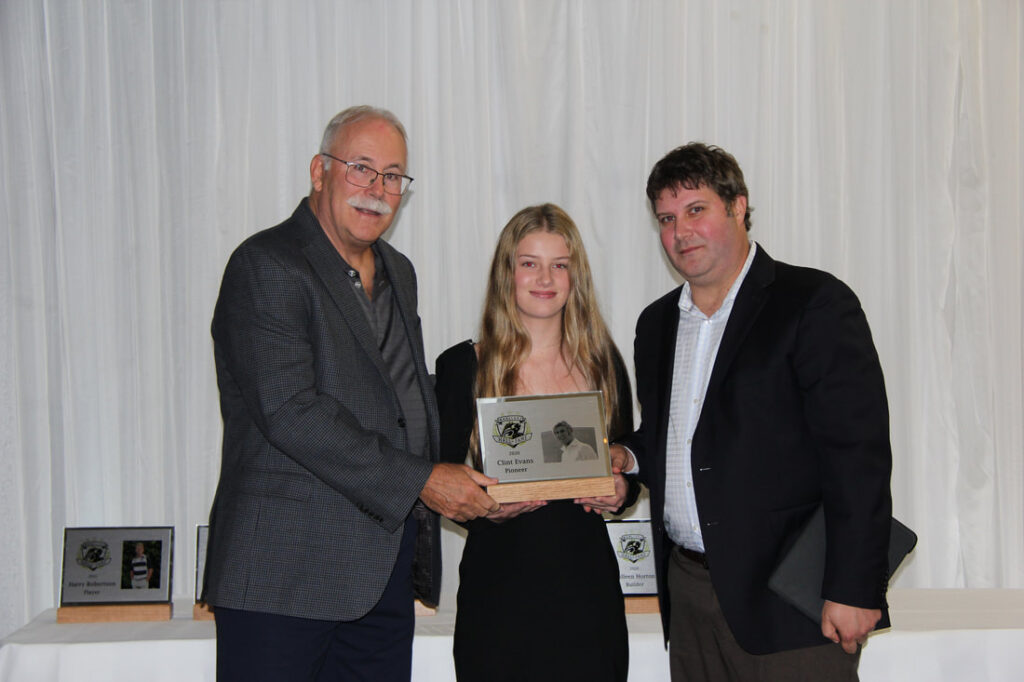 Figure 8. Posthumous presentation of MRHOF “Pioneer” award, October 30, 2022, to Clint Evans, accepted by his brother Bart Evans (left), granddaughter Amelia Evans (centre) and son Matthew Evans (right) (Photo courtesy of Bart Evans).